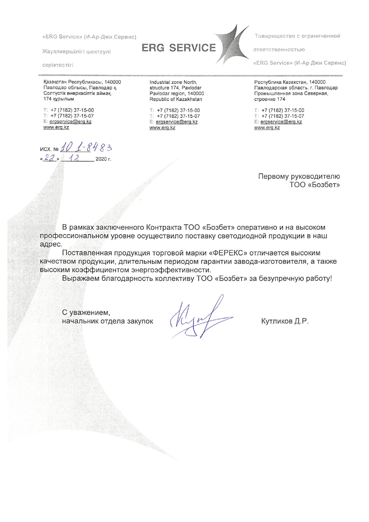 Благодарственное письмо ТОО ERG Service Благодарственное письмо ТОО ERG Service
