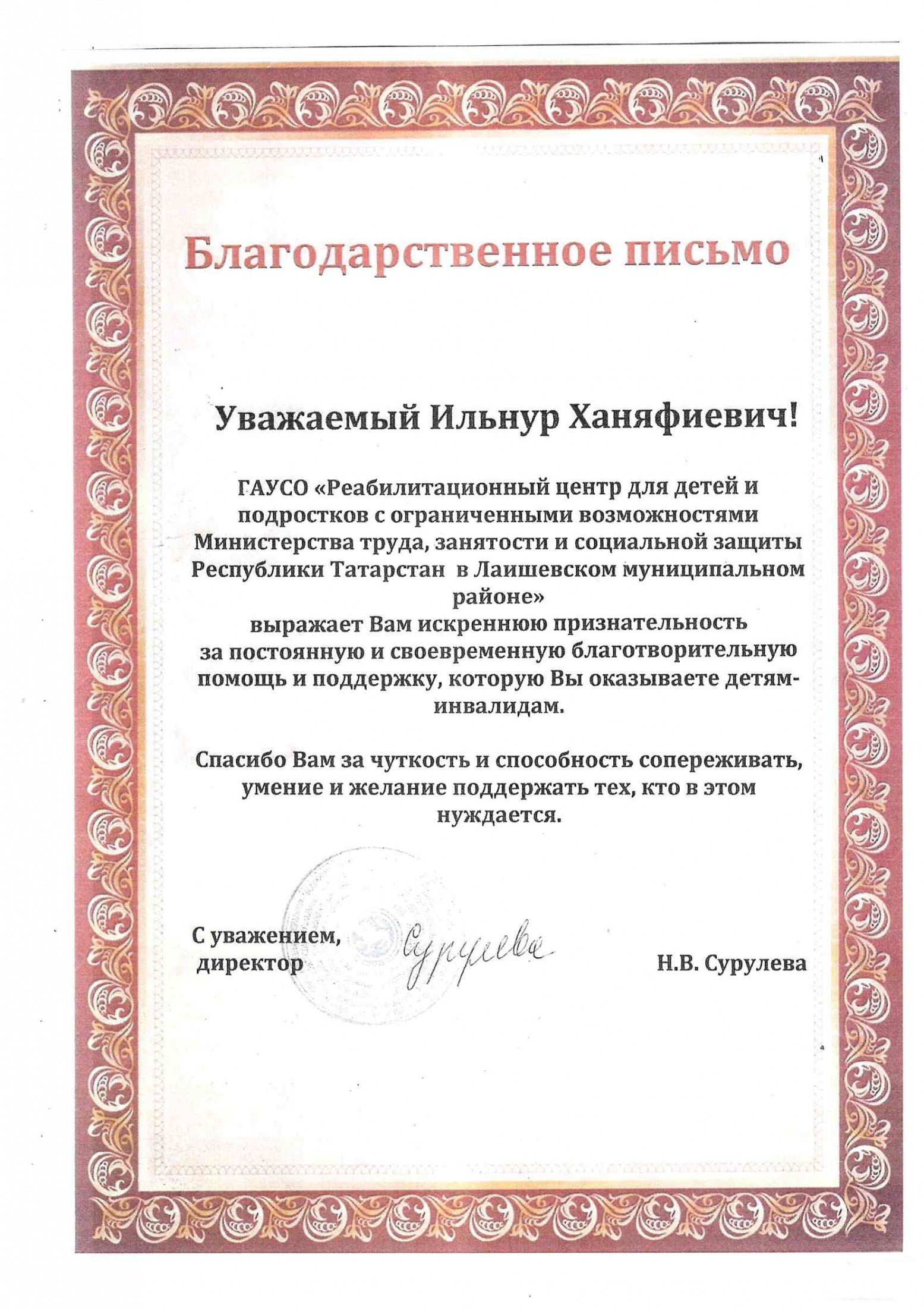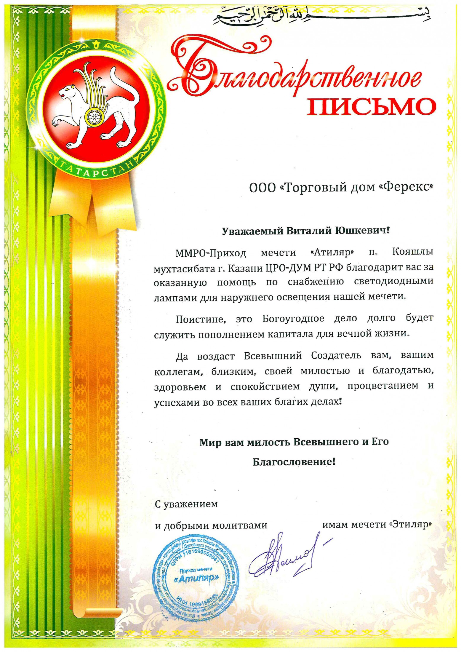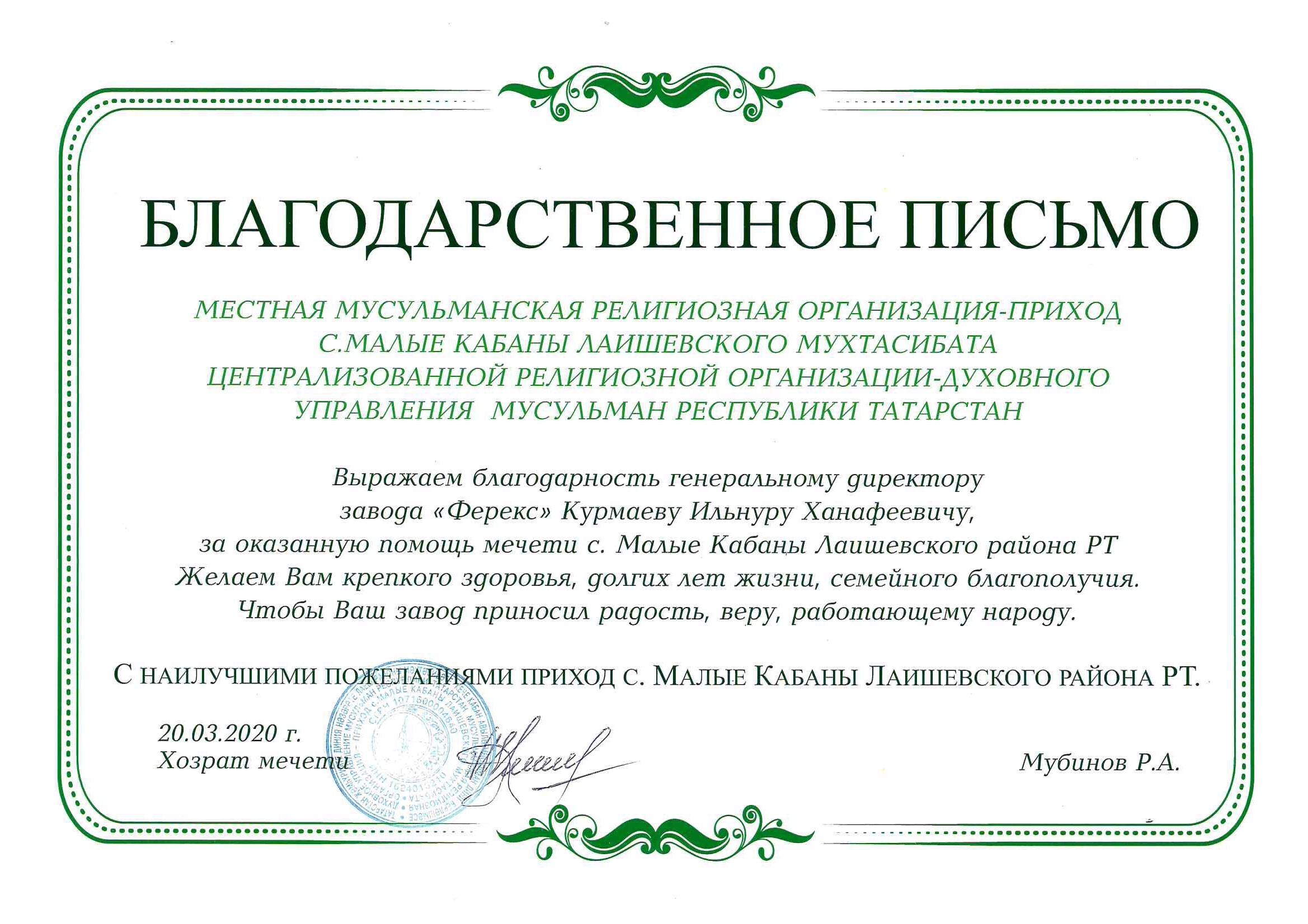 Благодарственное письмо от ММРО-Приход мечети «Атиляр» в п. Кояшлы.