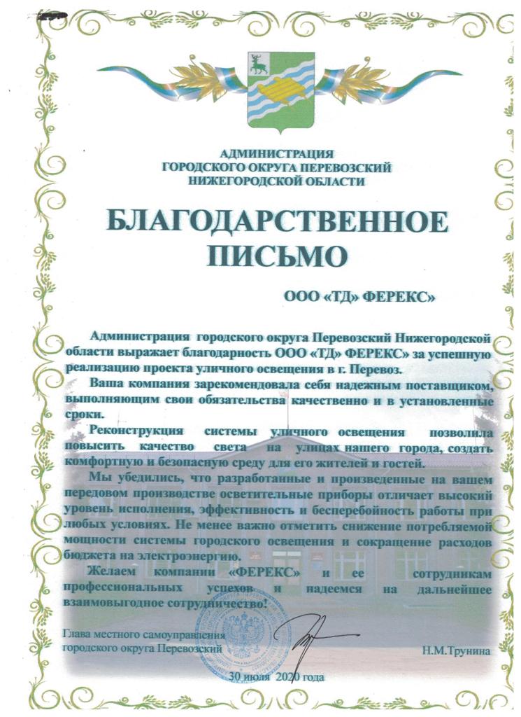Благодарственное письмо Администрации городского округа Перевозский Нижегородской области