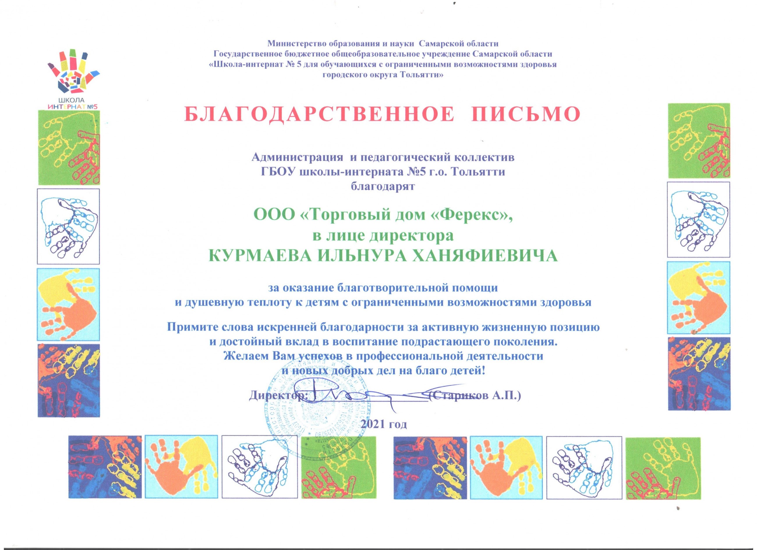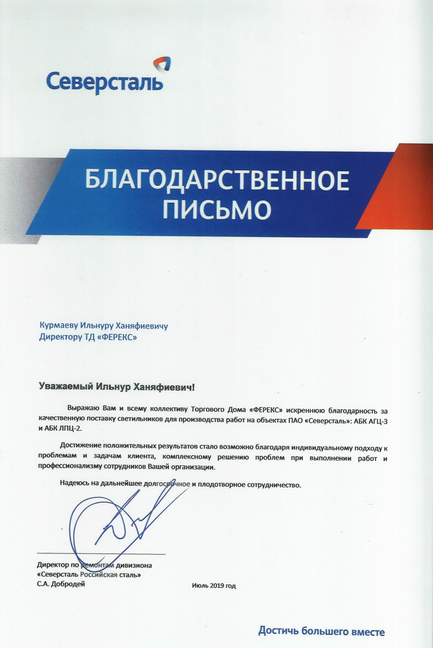 Благодарственное письмо от «Северсталь»