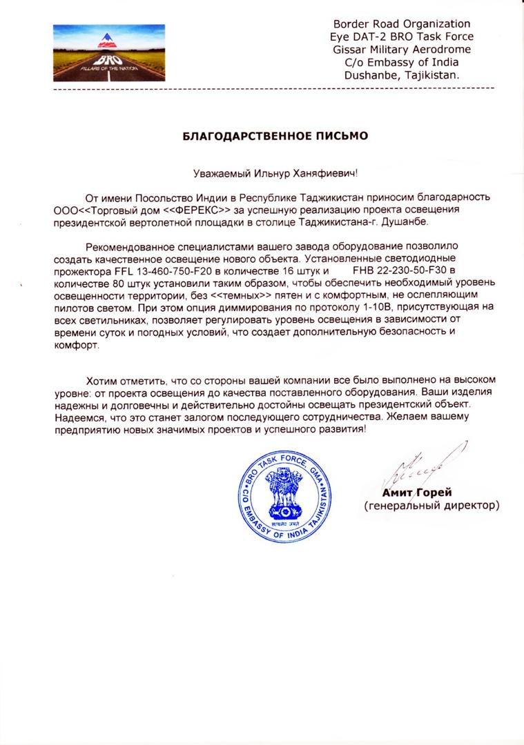 Благодарственное письмо Посольства Индии в Республике Таджикистан