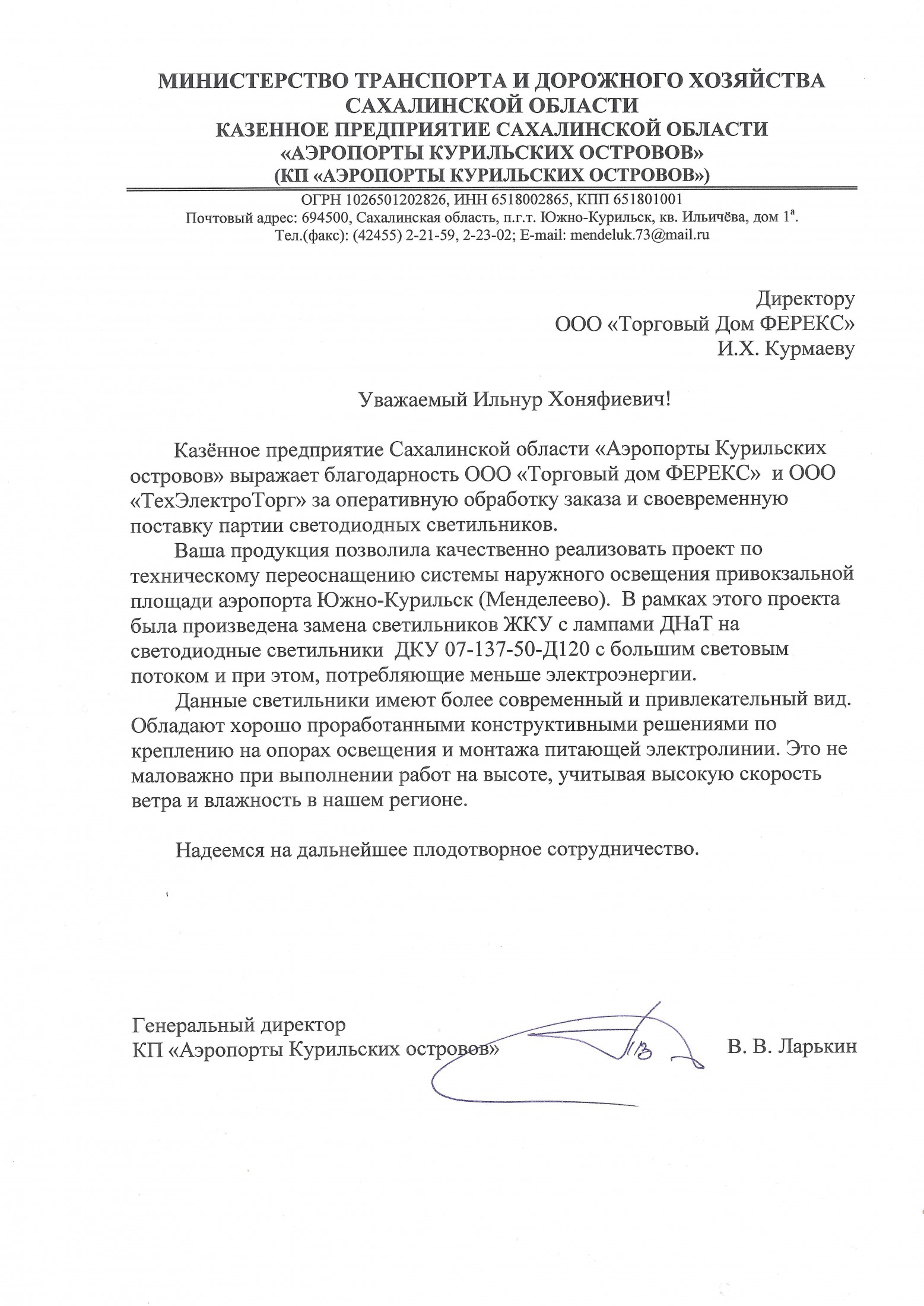 Благодарственное письмо КП Аэропорты Курильских островов