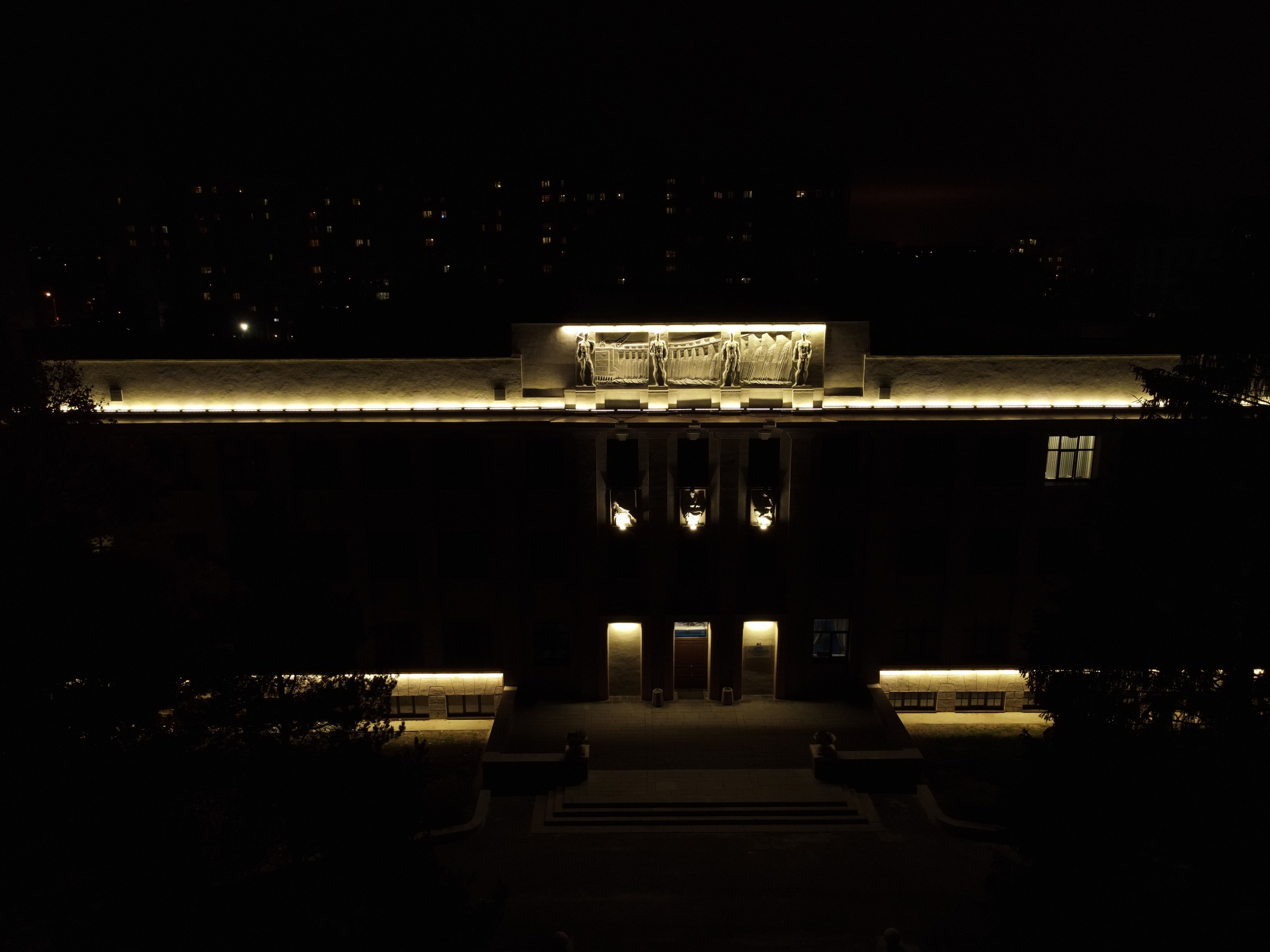 Предварительно был выполнен светотехнический расчет по фасаду здания и флигелям. Согласно расчетам было установлено 440 линейных светодиодных светильников серии FWL мощность по 12 Вт. Фактическая картина подсветки полностью соответствует расчетной концепции - смотрите видео.